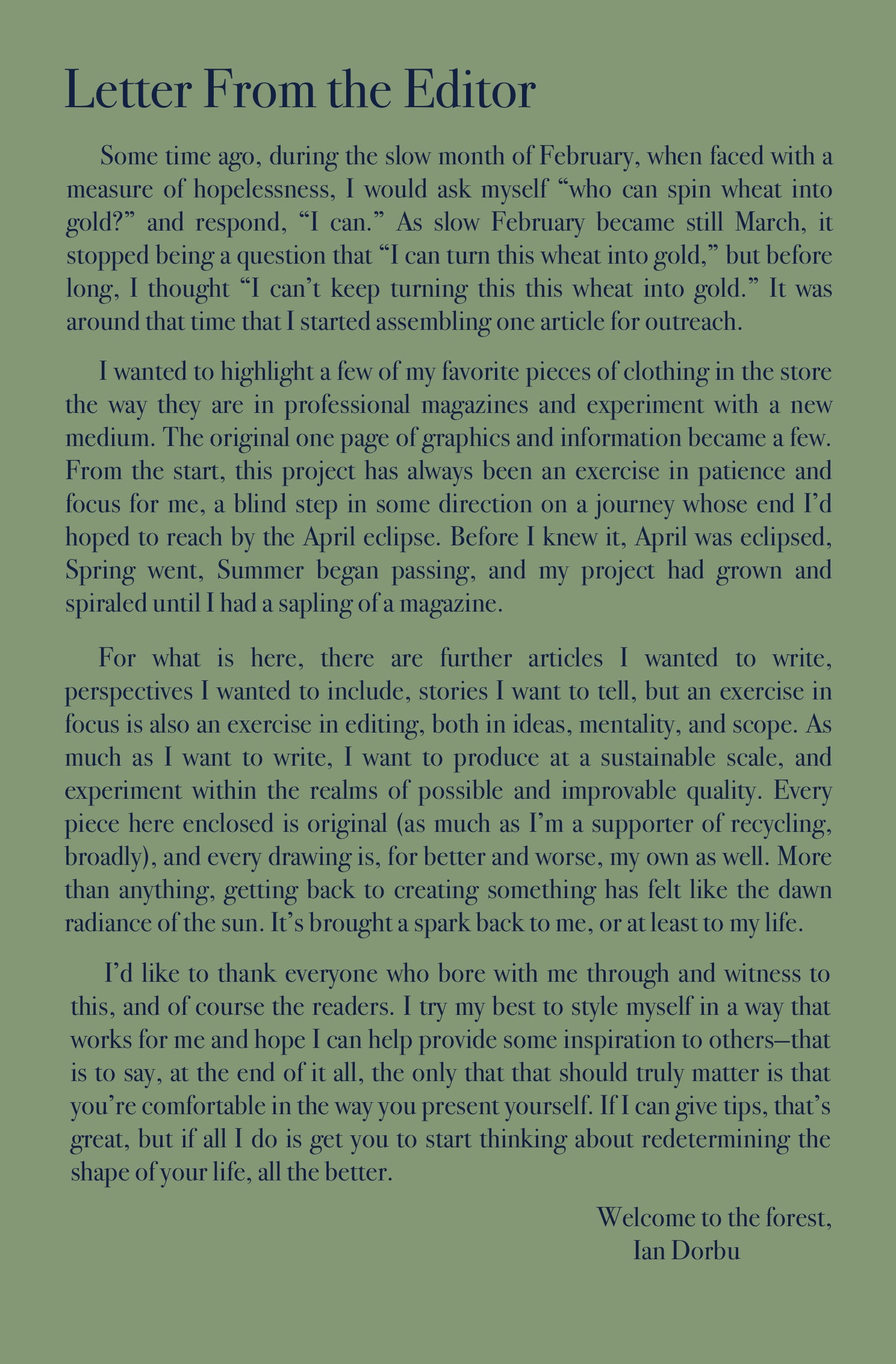 This project was also a much needed creative outlet that drew on many forgotten years of reading magazines. It was challenging, and stretched me in different ways, but ultimately was fun.