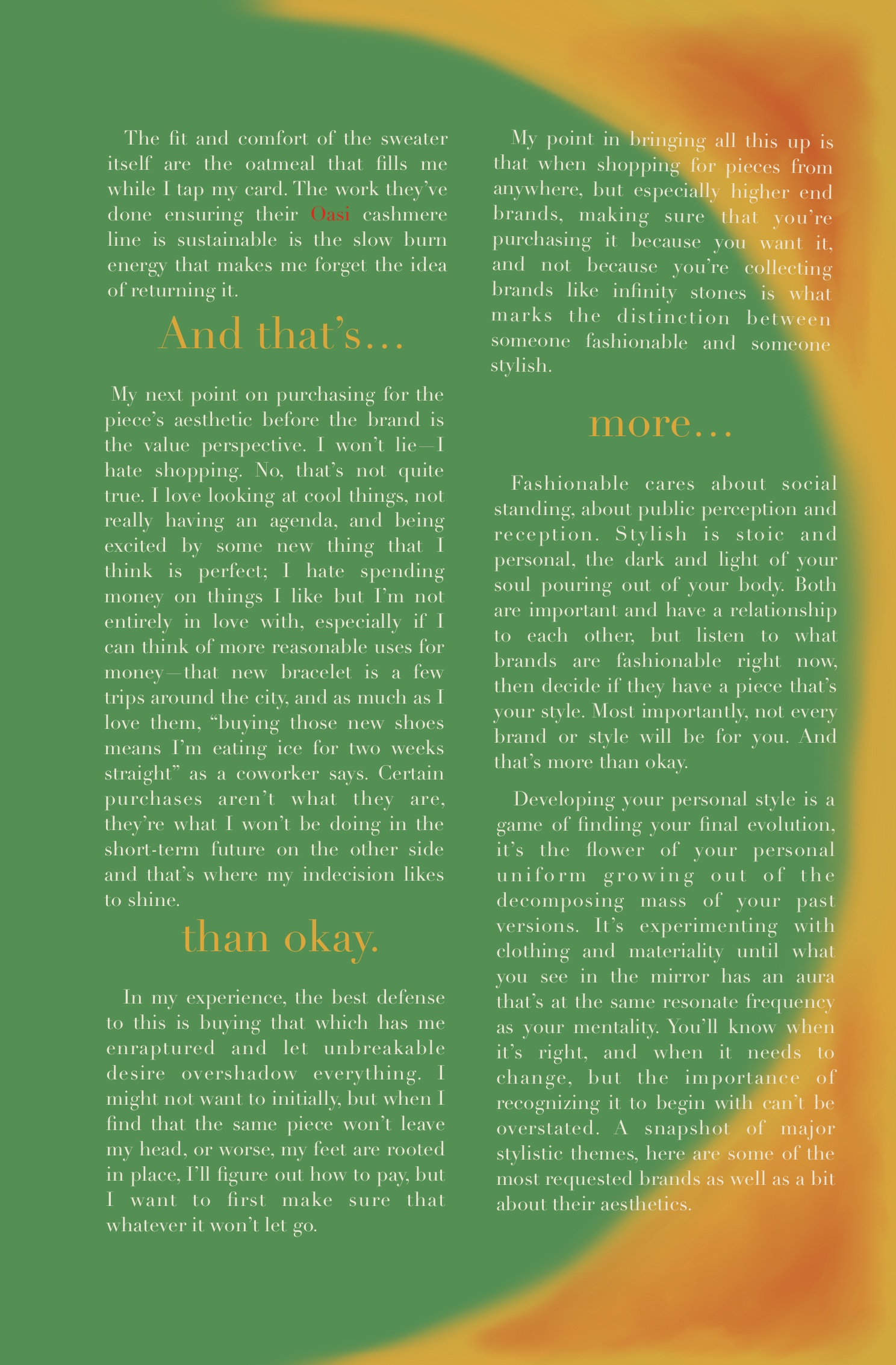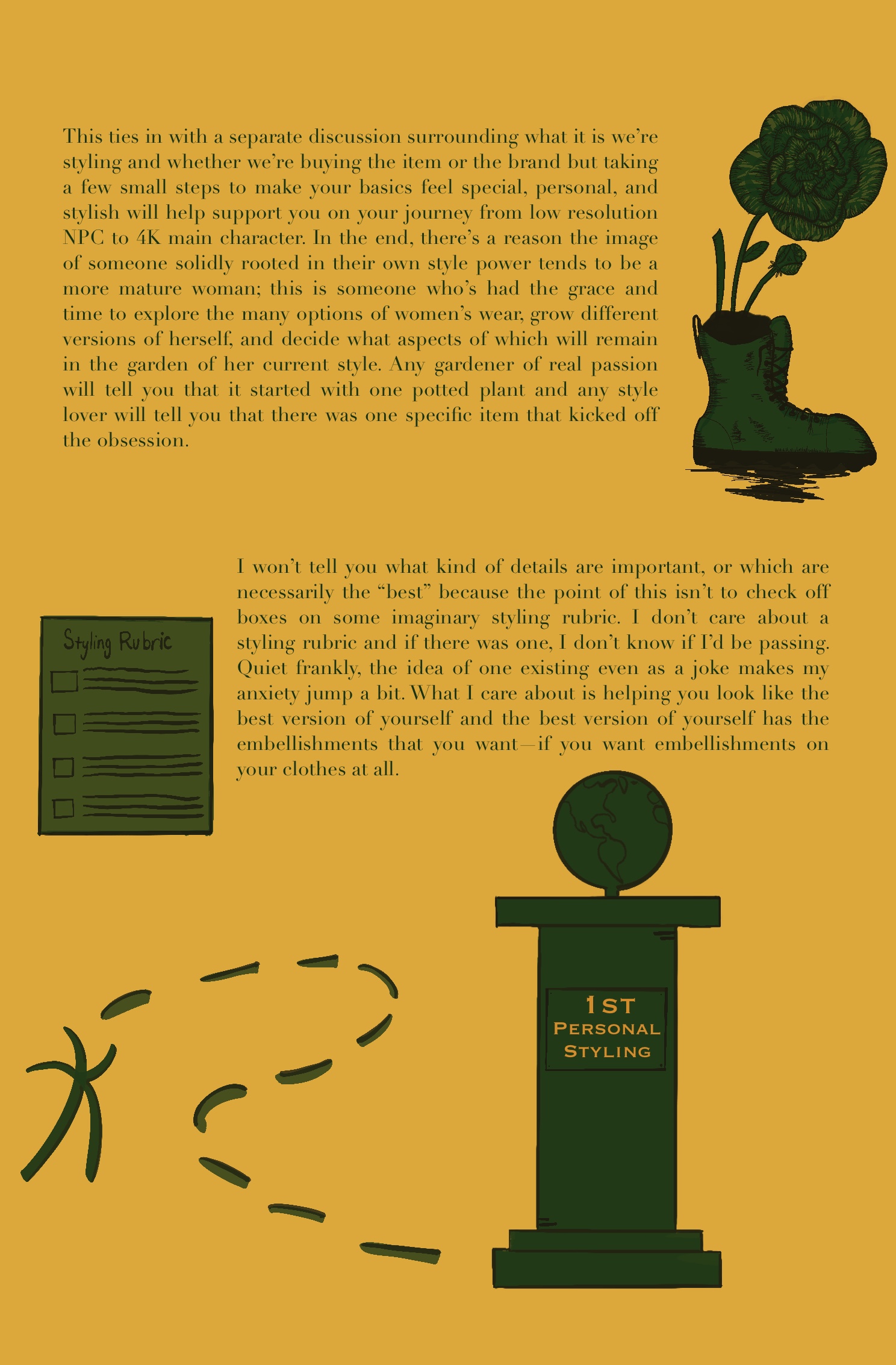 The Stag’s Path is part of my journey through and from retail, a field guide made as I navigated the landscape. Discussing styling and fashion in this way is something I’ve considered to always be for other people, but through my current job, I’ve come to incorporate it into the forefront of my daily life, unconsciously or otherwise. Work aside, I was listening to the audiobook of The Golden Thread: How Fabric Changed History by Kassia St. Clair some time ago and was struck by the introduction making explicit how integral fabric is to our humans experience, realizing that I will likely continue to spend my life wrapped in cloth.